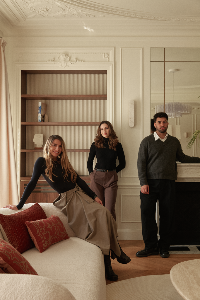 Les courbes répondent aux moulures d’origine, le mobilier arrondi s’installe avec discrétion, et les grandes fenêtres rythment l’espace d’un éclat calme.