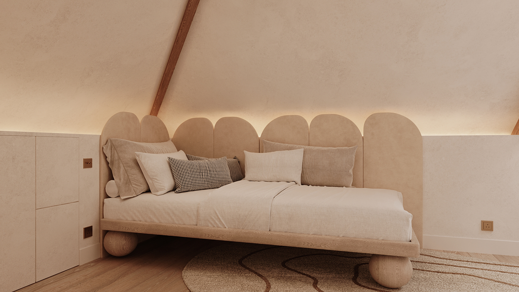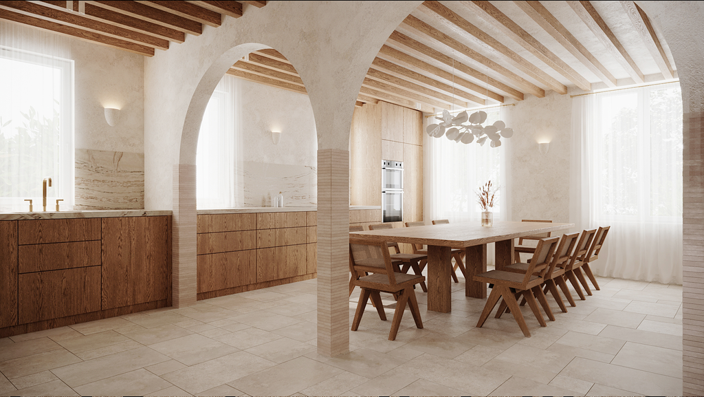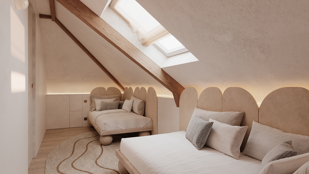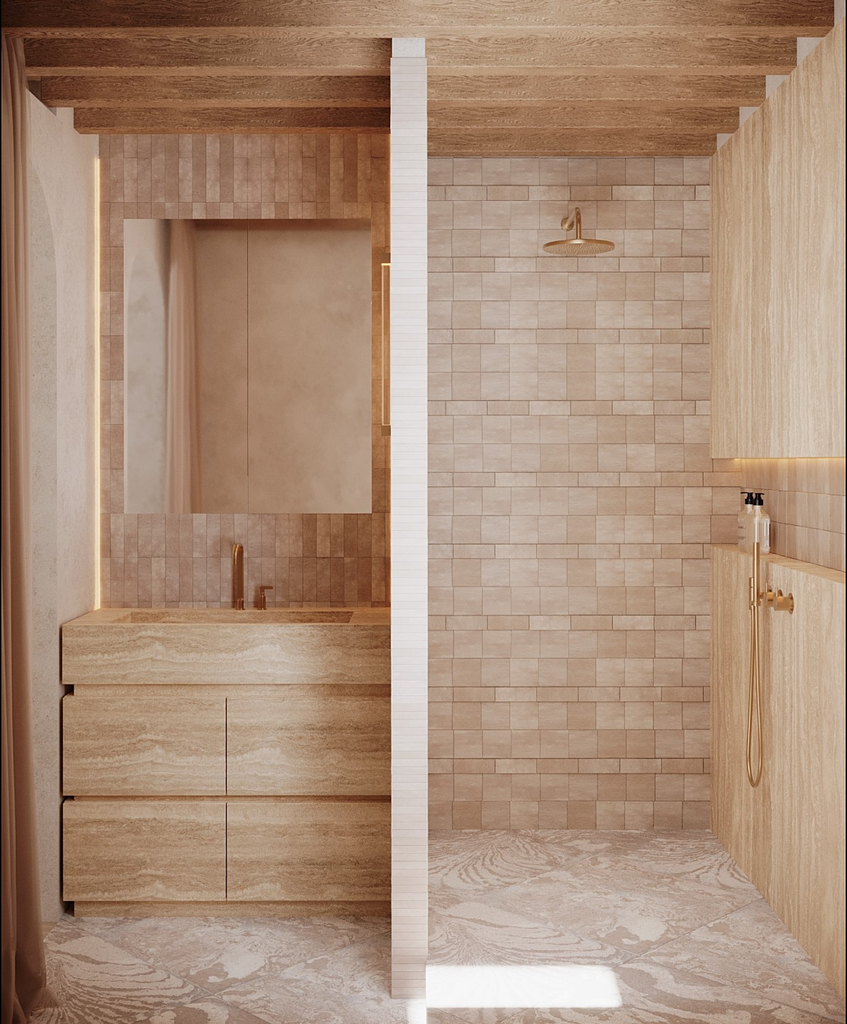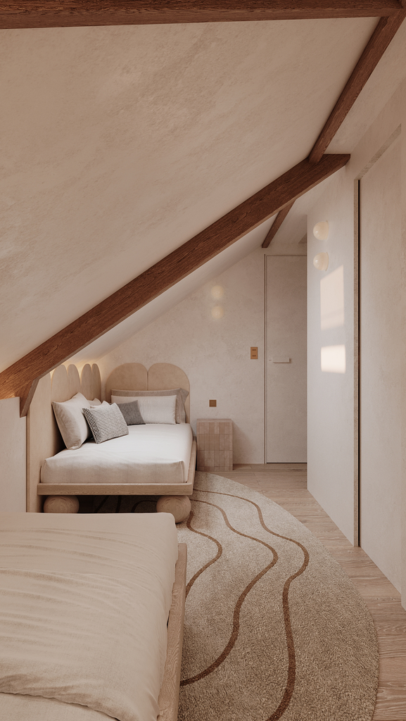 Les poutres anciennes, mises à nu et restaurées, deviennent le fil conducteur du projet. Autour d’elles, un jeu de matières brutes – pierre, bois patiné, enduits minéraux – dialogue avec des lignes épurées et des volumes revisités.